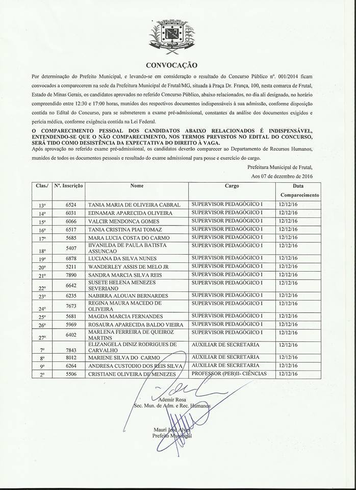 Saiu mais uma convocação chamando aprovados do Concurso Público da Prefeitura de Frutal. São vagas de supervisor pedagógico e auxiliar de secretaria. Os interessados deverão se apresentar no dia 12 de dezembro para posse. Confira a lista clicando na imagem abaixo.