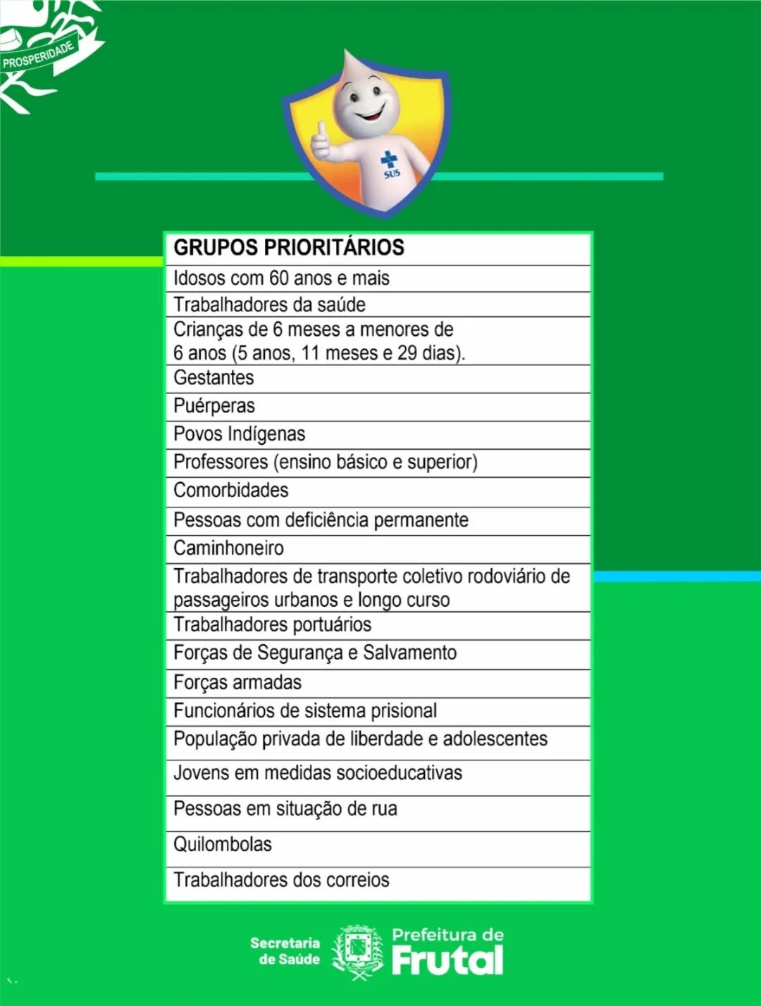 Deslize para o lado e confira também a tabela completa com os grupos prioritários que serão vacinados neste primeiro momento, conforme recomendação do Ministério da Saúde.