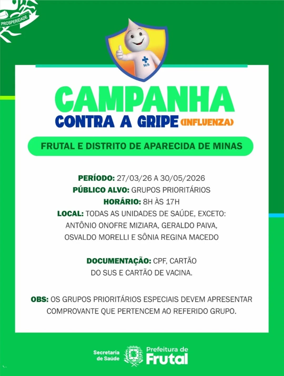 A Prefeitura de Frutal inicia hoje, sexta-feira, dia 27 de março, a Campanha de Vacinação contra a Influenza